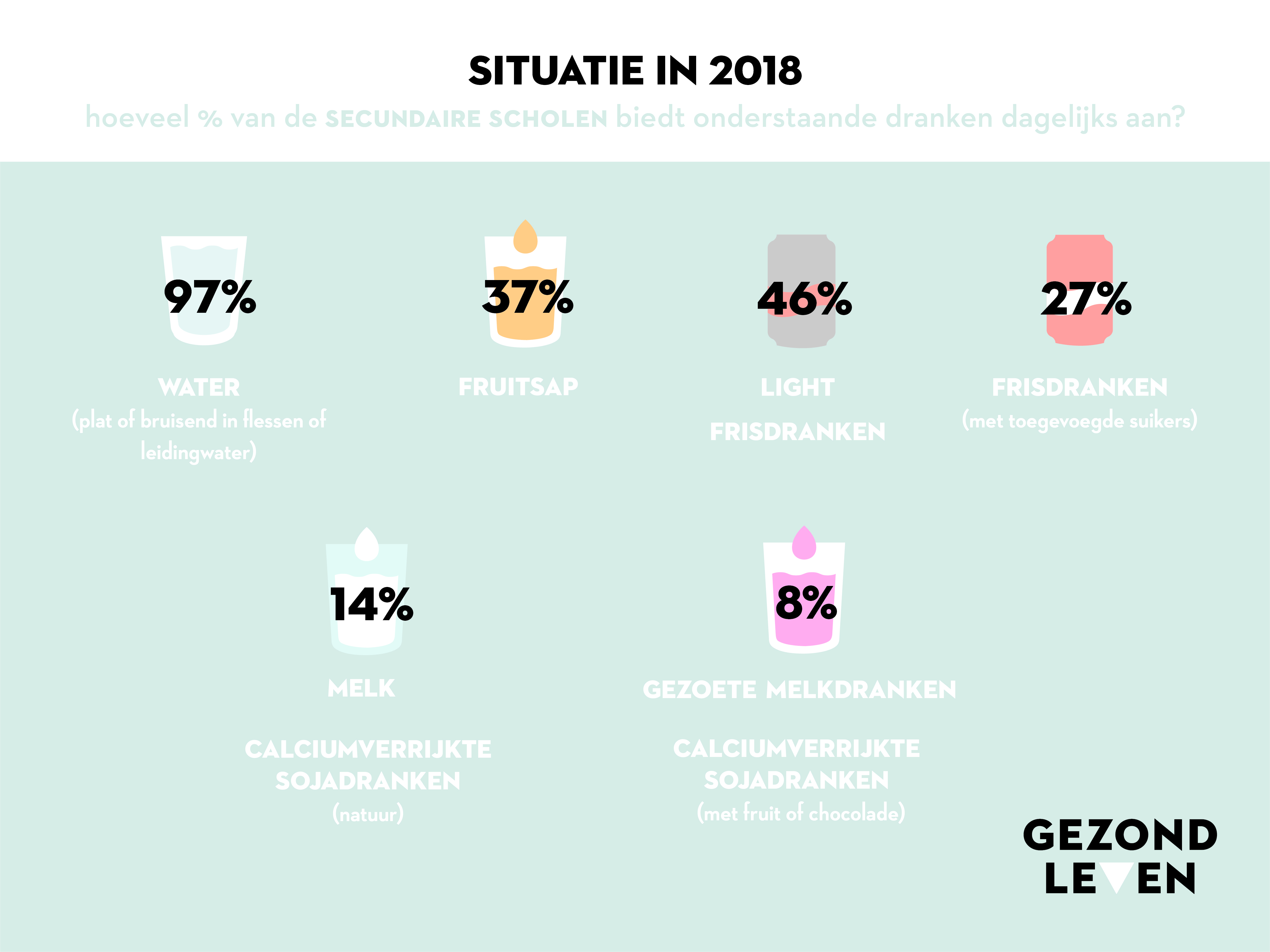 In 2016 ondertekenden Vlaams minister van Onderwijs Hilde Crevits, Vlaams minister van Welzijn, Volksgezondheid en Gezin Jo Vandeurzen, de verschillende onderwijskoepels, verschillende partners uit de voedingsindustrie, de koepel van automaatleveranciers, vertegenwoordigers voor (drink)water, cateraars, het Vlaams Instituut Gezond Leven en verschillende onderwijspartners een engagementsverklaring. Die heeft als doel basis- en secundaire scholen te motiveren om tegen het schooljaar 2020–2021 ongezonde dranken en tussendoortjes te bannen en enkel nog gezonde alternatieven aan te moedigen.